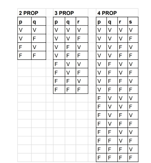 c) No caso de três proposições, serão oito linhas. A primeira coluna fica: V, V, V, V, F, F, F, F. A segunda fica: V, V, F, F, V, V, F, F.